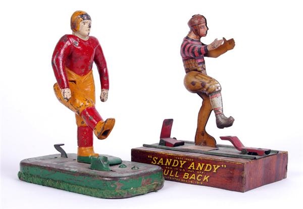 1) 7 1/2'' "Sandy Andy" Full Back tin litho game. You cock back the leg and release it so that it kicks the ball. The original ball is missing but the game works fine. 2) 8'' cast iron game that is played similar to the "Sandy Andy". The kicker has an "H" imprinted on the inside of his leg. Both show some wear with dings and scratches but both work and are well-made.