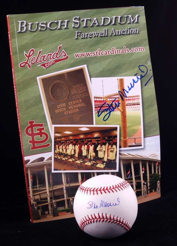 1) Official Major League (Selig) ball has been signed in Mint blue ink. Ball rates Mint. 2) Busch Stadium Farewell Auction catalog from 2005 has been signed in Mint blue ink on the cover. Near Mint/Mint.
