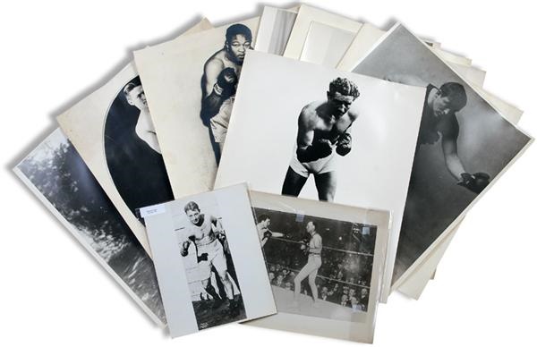 Size 11" x 14" second generation photographs (3) including Stanley Ketchel, Charley Scott & Mike Jaffe (owner of Champs Gym) and Firpo knocking Dempsey through the ropes. 20" X 24" second generation photographs (11) including Primo Carnera, Kid Gavilan, James Jeffries, Joe Gans, Max Baer, Tommy Burns, Jess Willard, Jersey Joe Walcott and Tommy Loughran. 11" x 14" "Old Boxing Scene" photographic print (1) by David D.Smith. 14" x 17" second generation photographs (2) including Robert Fitzsimmons and a George Gardiner square-off photograph. Conditions average VG to EX.