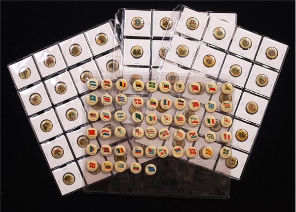 One lot of (108) different pins, almost all having the original Sweet Caporal labels on the back. Includes (53) State Seals (includes Alaska and Indian Territory) and (55) Country Flags. Grades range from Excellent to Near Mint with most EX-MT.
