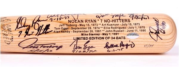 33'' Louisville Slugger 180 bat commemorates Ryan's 7 No-Hitters and lists the date and each catcher on the barrel. The barrel has been signed in Mint black ink by Nolan Ryan, Art Kusnyer, Mike Stanley, Jeff Torborg, Tom Egan, John Russell, Alan Ashby, and Ellie Rodriguez. Ryan has added "7 No Hitters" beneath his signature while the other playesr have added the date of the games beneath theirs. The bat is limited edition number 17 of 34 and rates Near Mint. Accompanied by a COA from Mounted Memories and has their stickers and a MLB authentication sticker affixed to the bat.