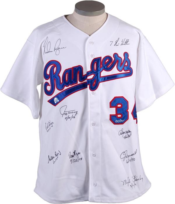 White, home jersey has been signed by Nolan Ryan and the 7 catchers caught his no-hitters in Mint black ink. Signatures include: Nolan Ryan, Jeff Torborg, Art Kusnyer, Tom Egan, Ellie Rodriguez, Alan Ashby, John Russell, and Mike Stanle. Each player has added the date of the game beneath their signature with the exception of Ryan who has written "7 No Hitters" across from his sig. The jersey is Mint and is numbered 25 of 34 with a Mounted Memories sticker & LOA included. The tagging has been removed but I would guess it is an XL.