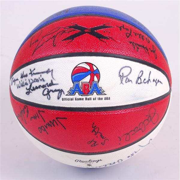 Classic Red White and Blue ABA Basketball has been reunion signed in 2005 by 25 ABA Legends. Signatories include Dr. J., Iceman Gervin, Moses Malone, Warren Jabali, Artis Gilmore, Bad News Barnes, Mack Calvin, Sam Lacey, Joe Hamilton, Ollie Taylor, Fatty Taylor, James Silas, Ronald Behagen, Goo Kennedy, Willie Davis, Leonard Gray, Mike Green, Jumbo Eakins, Cincy Powell, Ralph Simpson, Willie Rogers, Al Smith, Rick Darnell, Mike Davis, Collis Jones. NRMT. Lelands LOA.