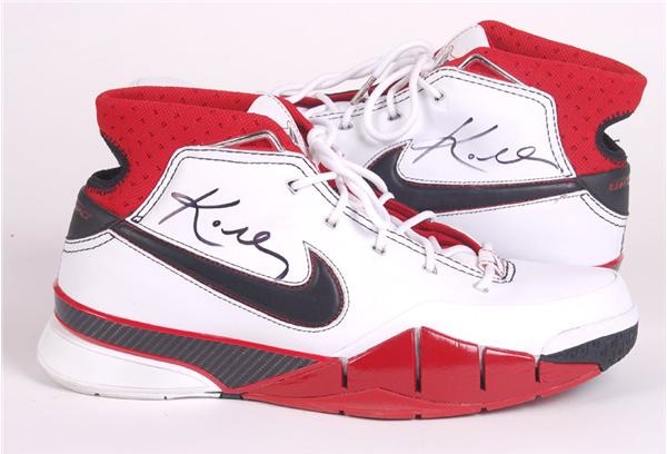 Pair of size 12 red, white and black limited edition Nike All Star Uptempos. Kobe has signed each sneaker on the side in Mint black ink. Shoes rate Mint with the original box included.