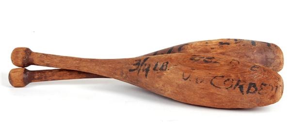 Two 17'' 3/4 lb wooden Indian Clubs used by boxing great James J Corbett. Both shows definite use. "3/4 lb" and "used by J J Corbett" have been written on both clubs in black ink.
