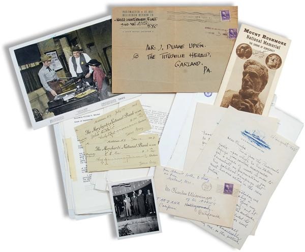 1) This beautifully colored 8 x10" movie still from a scene in "Destry" features a turquoise ink signature of the legendary soldier, movie actor and country music composer. Audie Murphy is the most decorated U.S. soldier from WWII receiving the Medal of Honor along with 32 additional medals from the U.S. government, however he also received 5 medals from France and 1 from Belgium for his incredible valor and bravery in battle. Affixed to the verso is a first edition stamp of Audie Murphy printed in 1999. The photograph is in excellent condition with no creasing and great color quality. A great piece that honors one of America's greatest heroes. 2) Admiral William D. Leahy was the first U.S. military officer ever to hold a five-star rank. This is a letter he wrote to his childhood friend actor Charles Winninger in August, 1946, while he was traveling with President Truman serving as Chief of Staff to the Commander in Chief of the Army and Navy. Leahy was known as being critical of the bombing of Hiroshima and Nagasaki. Shortly after he wrote this letter Leahy resigned, in March, 1949, and the following year published his war memoirs, “I Was There.” Included with this letter are two small photos, one of Winninger, the other of Leahy. 3) Collection of ephemera related to Gutzon Borglum, the famous sculptor of The Presidents at Mount Rushmore. Included is a signed Mount Rushmore brochure, souvenir envelope, a postcard and several personal and fan letters. 4) For fan's of this great american author best known for his popular adventure novels that portrayed an idealized version of the wild west this is the lot for you. The lot includes 2 signed checks with the author's signature clearly legible. One check is written to John Butler in the amount of $100 dated July 17, 1916 drawn on an account from The Merchant's National Bank in Middletown, N.Y. The other, drawn from the same account, is dated Jan 12, 1917 and is written to an L.L. Bow for $3 dollars. Each check has the banks perforation marks but are in EX condition. 5) The artist and illustrator is best known for his iconic 1917 I Want You, Uncle Sam Army recruitment poster, of which more than 4 million copies were produced for WWI, and was again revived for WWII. The great thing about this envelope is that it is entirely penned in his own hand. The quality is VG with the writing being bold black ink and clearly legible. 5) This is a collection of 100+ letters written to the office of Kentucky Congressman William Natcher who served in office from 1953-1994. Almost all of the letters originate from various government offices and is written on those office's official stationary. For example there is a letter of resignation from the Postmaster General, several letters from various senator and fellow congressman offices and all sorts of other politically oriented documentation. You'll spend hours perusing through this multitude of letters and will be amazed by some of the names behind the correspondence.