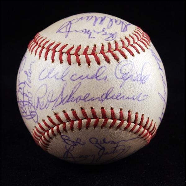 Official National League (Giles) ball has been signed by 23 members of the National League Champions. Includes: Orlando Cepeda, Red Schoedienst, Steve Carlton, Bob Gibson, Curt Flood, and more. Signatures rate 8 to 9/10 out of 10. Ball is a nice cream color with some very light staining.