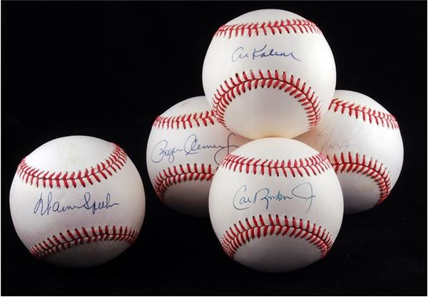 1) Official 1991 All-Star Game ball has been signed by Cal Ripken Jr in Mint blue ink. 2) Official American League (Brown) ball has been signed in Mint blue ink by Roger Clemens. 3) Official American League (Brown) ball has been signed in 8 to 9 out of 10 blue ink by Al Kaline. 4) Official National League (Giamatti) ball has been signed in Mint blue ink by Warren Spahn. 5) Official American League (Brown) ball has been signed in VG to EX blue ink by Nolan Ryan. The balls have some toning and light staining and rate VG to EX+.