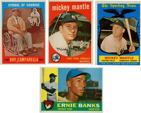 Key cards grade: #564 Mantle AS (VG-EX), #20 Banks (EX-MT), #10 Mantle (EX-MT), #550 Campy Wheelchair (NM-MT), #478 Clemente (EX), #461 Mantle Thrills (EX-MT), #40 Spahn (EX-MT), #202 Maris (EX-MT), #380 Aaron (EX-MT), #163 Koufax (G/VG), #439 Brooks Robinson (NM-MT), team cards, thrills, All-Stars, rookies and more. There are many more stars and Hall of Famers not listed, in fact, there are more stars than commons in this lot. Cards grade VG to NM-MT with most EX-MT or better