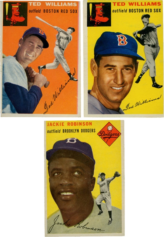Includes (24) 1954 Bowman cards with Pee Wee Reese (NM) and Duke Snider (NM). (25) Topps cards with Ted Williams #1 (EX-MT), #250 Ted Williams (VG-EX), #10 Jackie Robinson (EX-MT), and more. Conditions range from VG to NM-MT with most about EX-MT.