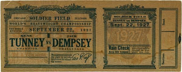 Authentic full ticket to the famed "Long Count" fight Sept 22, 1927 at Soldier Field. The seat and section numbers are present, but the print has faded with age. There is some toning from moisture on about 1/2 of the surface of the front of the ticket. Overall VG.