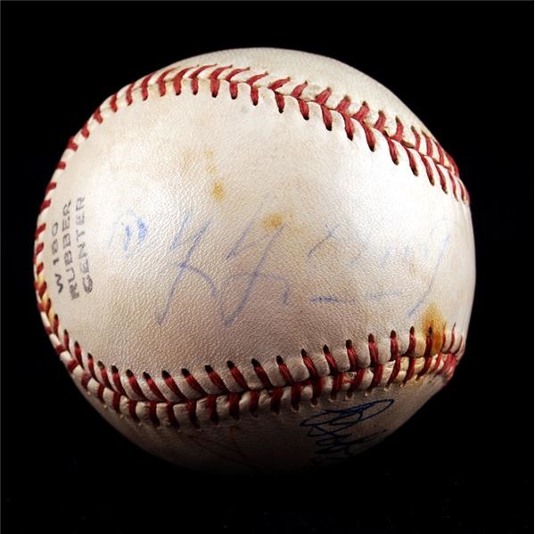 Wilson Official Approved League ball has been signed 4 players. Young has signed the side panel next to the sweetspot with Bob Feller, Jim Catfish Hunter and Turk Reilly on other panels. Signatures rate 5/6 to 9 out of 10. Ball has some light toning and mild staining.