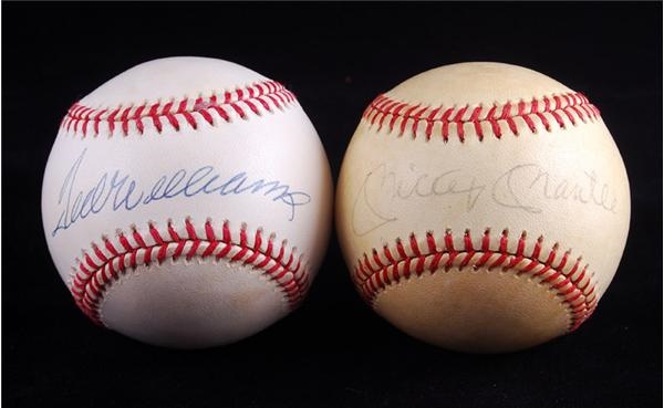 1) Official American League (Brown) ball has been signed in 9 out of 10 blue ink by Williams. Ball has some light staining and rates EX+. 2) Official American League (Brown) ball has been signed in 7 to 8 out of 10 ink by Mantle. Ball has some toning and staining.