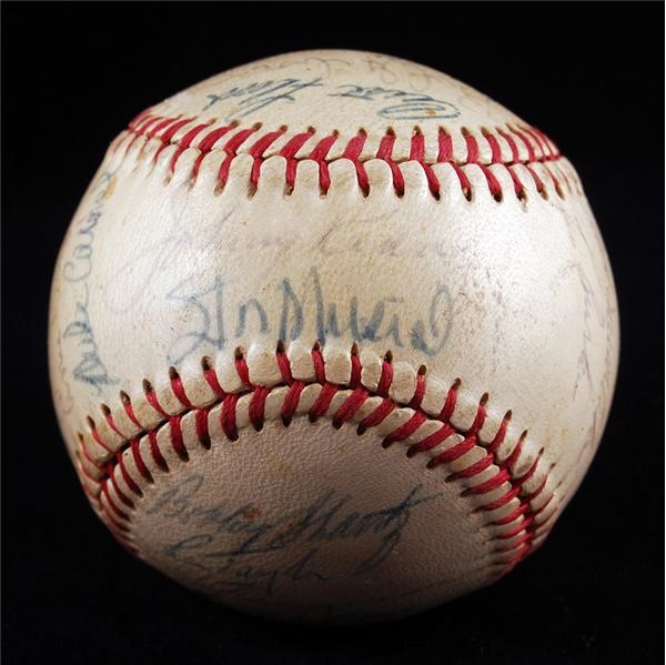 Newsom Official League ball has been signed by 22 members of the team. Includes: Bob Gibson, Stan Musial, Curt Flood, Simmons, Ken Boyer, Shantz, and more. Signatures rate 4 to 7/8 out of 10 with most being 6's or better.Ball has some light toning and mild staining.