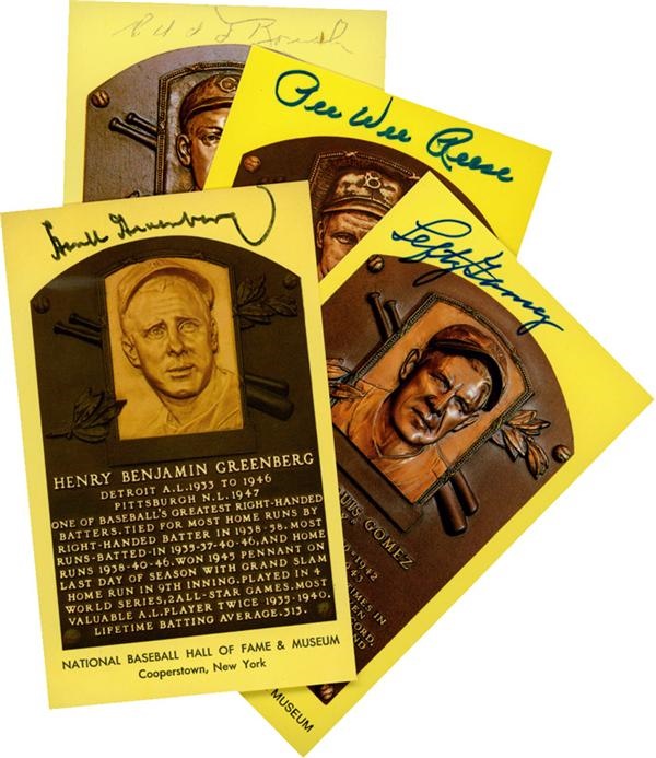 HOF plaque post card collection (16) includes scribes from the following baseball greats: Happy Chandler, Burleigh Grimes, Judy Johnson, Ted Lyons, Bill Terry, Edd Roush, Lloyd Waner, Hank Greenberg, George Kell, Earl Averill, Joe Sewell, Carl Hubbell, Pee Wee Reese, Lefty Gomez, Chas Gehringer and Lou Boudreau. Mint except for Terry which has a slight tear affecting his signature.