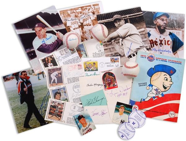 Great multi-sport collection of autographs that includes cards, baseballs, index cards, photos and more. The autograph range from 6 to 10 with most being Mint. Items range from G to Mint with most being EX or better. Misc. items: Joe Dimaggio golf scorecard, John Havlicek golf scorecard, Joe Dimaggio album page, Bob Feller hall of fame ad, Johnny Unitas ad, and more. Six First Day Covers include: Cal Ripken Jr (2,131 Games), Nolan Ryan & Robin Ventura (Seventh No-Hitter), Joe Namath, Mark McGwire (Homerun Record), Cool Papa Bell, Bart Starr. Fifteen 3 x 5'' index cards: Rube Marquard, Red Grange, Tito Landrum, Scott Sanderson, Leon Durham, Lou Brock, and more. Thirteen photos: Billy Herman, Ray Dandridge, Mike Ditka, Yogi Berra, Brooks Robinson (personalized), Warren Spahn & Johnny Sain, Buck Leonard, Wade Boggs, Bobby Doerr, Bob Lemon, Preacher Roe, George Foster, and Wilmer Fields. Five baseballs: Cal Ripken Jr & Billy Ripken, Tom Lasorda, Juan Gonzalez, Don Clendenon, and one more. One hundred two cards: Billy Pierce, Charles Barkley, Hakeem Olajuwon, Reggie Miller, Wes Unseld, J.R. Reid, John Paxson, Detlef Schrempf, Danny Manning, BJ Armstrong, Scottie Pippen, Manute Bol, Sean Elliott, Brad Daugherty, Steve Kerr, Larry Nance, David Thompson, Bill Cartwright, Mark Price, Larry Brown, John Williams, John Salley, Danny Ferry, Harvey Grant, Jeff Hornacek, Jeff Malone, Sarunas Marciulionis, Johnny Dawkings, Chris Dudley, Tom Chambers, Kevin Willis, Kenny Anderson, Derrick Coleman, Tom Gugliotta, Mookie Blaylock, 1962 American Tract Society Bobby Richardson, and 1962 American Tract Society Al Worthington.