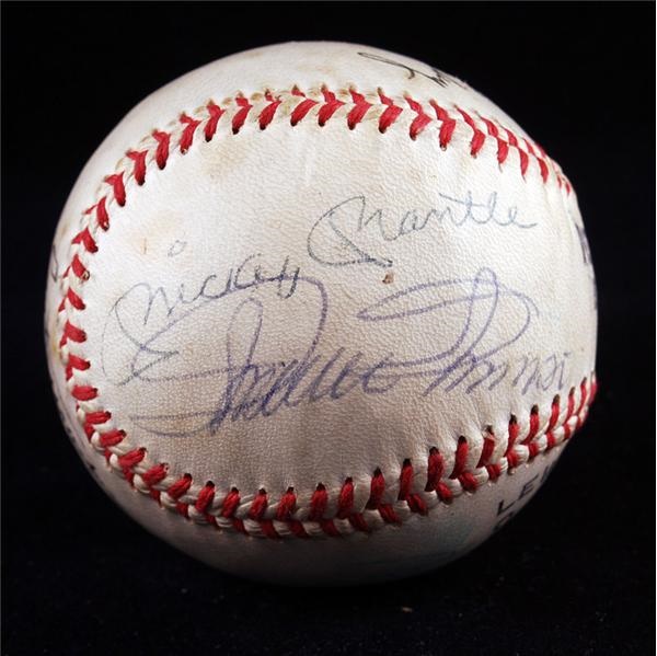North Pete Ward Baseball Clinic ball has been signed by 6 players. Includes: Mickey Mantle, Billy Martin, Leo Durocher, Johnny Pesky, Minnie Minoso, Bob Shaw and one unidentified signature. The signatures rate 8 to 10 out of 10 with the exception of the Shaw that is smudged. Ball has some light toning and mild staining.