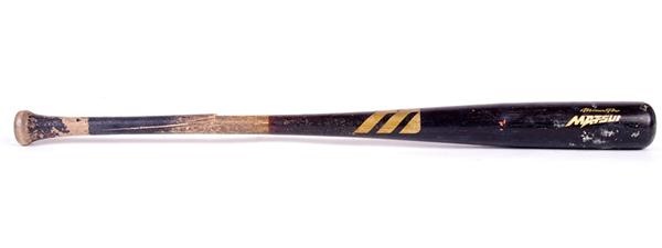 34'' Mizuno Pro model bat used by the Yankees slugger. Cracked at the handle. Shows great use with pine tar on the handle, numerous ball marks on the barrell and wear. The number "19" has been written on the bottom of the knob.
