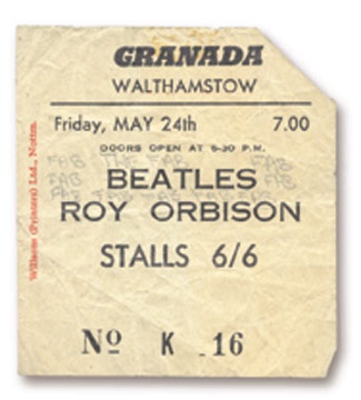 The first of three London stops for the 21 city tour. Earlier in the day, the group recorded their first "Pop Goes The Beatles" programs for the BBC. "FAB" has been hand-printed in pencil repeatledly around "BEATLES". Top right edge is perforated.