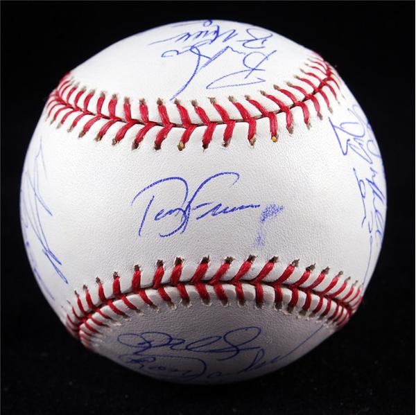 Official 2004 World Series (Selig) ball has been signed by 22 member of the World Champions. Includes: Manny Ramirez, Tito Francona, Jason Varitek, Curt Schilling, David Ortiz, and more. Signatures rate 10 out of 10. Ball has a few stray ink marks overall Near Mint.