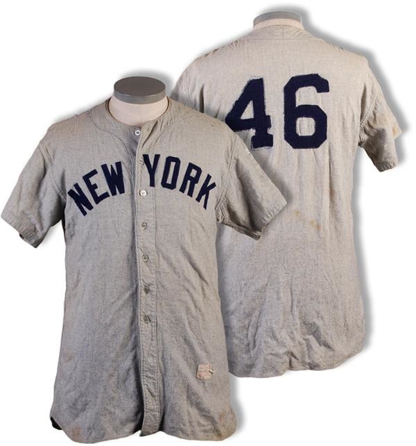 Grey, flannel road jersey has "NEW YORK" across the front. Wilson manufacturer's label on the front tail with the size "48" tag next to it. The "4" on the back has been replaced but the "6" is original. Shows good use with some staining and some small tears along with a few repairs.