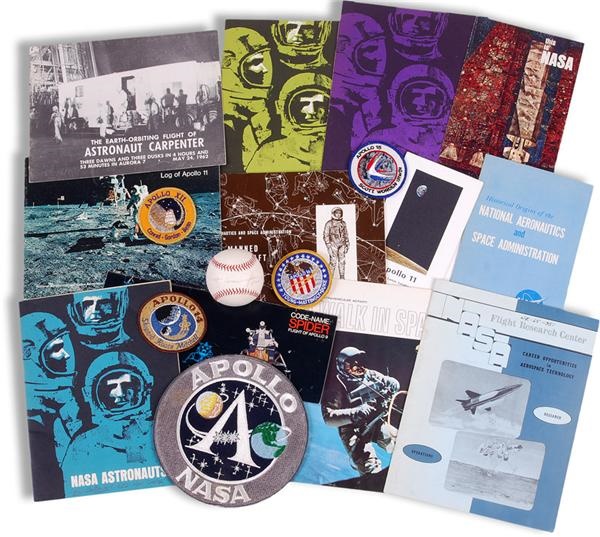 Included in this collection is an OAL (Brown) baseball signed on the Sweet Spot by Apollo 7 Astronaut Walt Cunningham as well as various pamphlets and brochures outlining and describing various Nasa missions during the latter half of the 20th Century. There are 21 brochure/program style booklets. Also included in this lot are 7 genuine Nasa patches, all of which are from various Apollo missions. The patches are all in VG condition and bring both value and interest to this lot. This collection is a true piece of aerospace history and any space travel buff will enjoy hours of entertainment perusing through the collection.