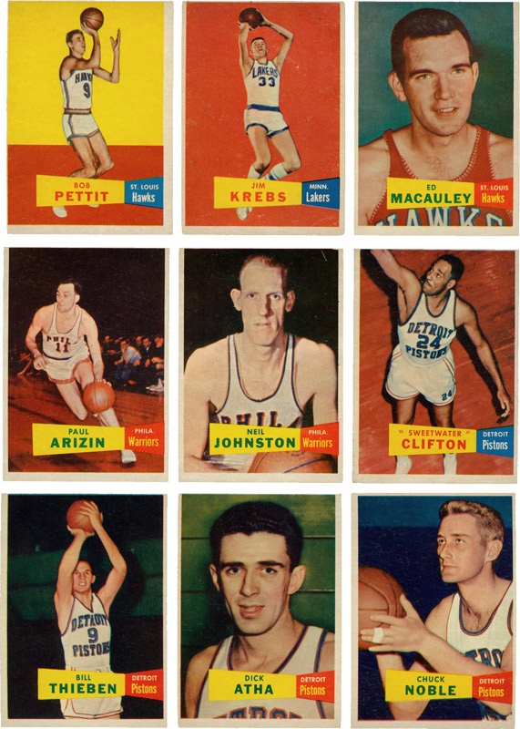 One lot of (39) different cards. Includes #1 Clifton, #3, #7, #10 Arizin, #11, #14, #20, #22, #23, #24 Pettit, #25, #27 Macauley, #28 Mikkelsen, #29, #31, #33 Costello, #34, #35, #38, #41, #42 Stokes, #44 Gola, #48, #49, #51, #53, #56, #60, #62 Gallatin, #63, #64, #65, #66, #67, #69, #72, #75, #76 and #79. Grades Good to EX/EX+ with most VG to VG-EX.