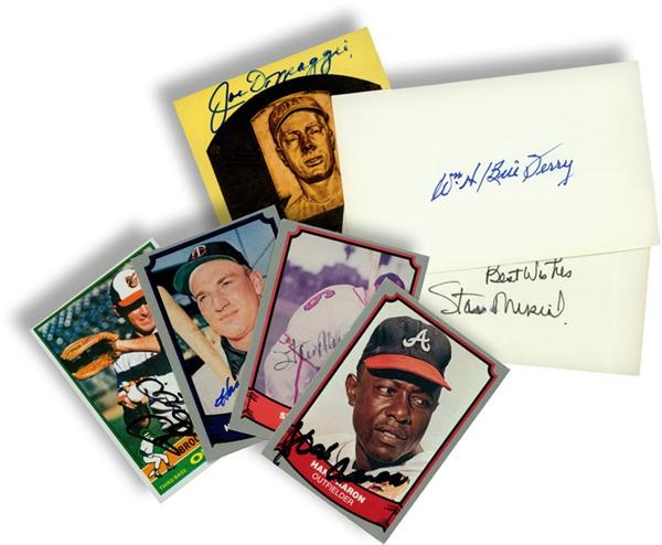 A nice collection of seventeen index cards, a Gold Hall of Fame Plaque, and trading cards. Includes: Joe Dimaggio, Hank Aaron, Fergie Jenkins, Ernie Banks, Sparky Anderson, Yogi Berra, Harmon Killebrew, Ralph Kiner, Jim Kaat, Stan Musial (x2), Bill Terry (x2), Duke Snider, Brooks Robinson (x2), and Joe Wood. Signatures rate 8 to 10 out of 10 with one or two grading less. Items rate Near Mint to Mint.
