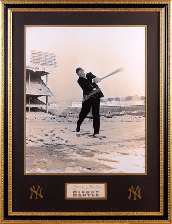16 x 24'' photo of Mickey Mantle hitting a snowball by Nat Fein matted and framed with 2 x 5'' card signed by Mantle in mint blue sharpie. Framed overall to 22 x 30''.