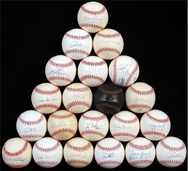 A nice mix of mainly OAL/ONL/OML balls with a few unofficial balls thrown in. The majority of the signatures rate Mint with about 10% grading less. The balls range from VG to Mint with most being EX with mild toning. Includes: Prince Fielder, Robinson Cano, Eddie Mathews, Cal Ripken Jr (x2), Duke Snider, Juan Marichal, Lou Brock, Lou Boudreau, Rollie Fingers, Bobby Doerr, Bob Feller, Orlando Cepeda, Don Sutton, Phil Niekro, Mike Schmidt (inscribed "20"), Gaylord Perry (x2), Monte Irvin, Bobby Doerr (inscribed "HOF 86"), Frank Robinson, AB Chandler (inscribed "HOF 1982"), Steve Carlton, Don Larsen (x2, inscribed "10-8-56"), Derek Jeter, Curt Schilling, Dwight Gooden (x2), John Wetteland (inscribed "WS MVP ‘96"), Tug McGraw, Babe Herman, Johnny Vandermeer (inscribed "6/11/38 6/15/38"), Charlie Silvera, Marty Marion (inscribed "1944 N.L. MVP"), Ron Necciai (inscribed "5/13/52 – 27k’s"), Forrest “Spook” Jacobs, Steve Garvey, Ned Garver (inscribed "20-12 1951"), Mickey Rivers, Frank Howard (inscribed "1968 1970 A.L. HR King"), Ron Leflore, Bret Saberhagen, Whit Wyatt, Randy Gumpert, Darryl Strawberry, Scott Rolen, George Brett, Frank Thomas (inscribed "1951-1966"), Kenny Lofton, David Wells, Dontrelle Willis (x2), Mark Prior, Josh Johnson, Derek Lowe (x2), Kyle Farnsworth, Wilson Betemit, Mike Myers, Tyler Clippard, Ron Villone, Scott Proctor, Brian Bruney, Chris Britton, Miguel Cairo, Doug Mientkiewicz, Jeff Karstens, Bobby Shantz (inscribed "1952 MVP"), Tommy Lasorda, Johnny Podres (x2, inscribed "1955 WS MVP"), Pete Rose (inscribed "#4256"), Ewell Blackwell (inscribed "6-18-47"), Phil Cavaretti (personalized to Russ), Bob Feller (x2, personalized), Greg Luzinski, Fergie Jenkins (x2, inscribed "7/21/91"), and more.