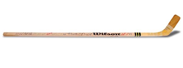 Wilson full sized stick signed by 22 members of the team including Linseman, Leach, Propp, MacLeish, Bridgman, Kelly, Wilson, Hill, Barnes, Watson, Gorence, Busniuk, McIlhargey, Peeters, Myre and more. All signatures are bold.