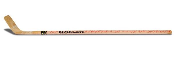 Wilson full size stick signed by 24 players including Dionne, Simmer, Taylor, Goring, Murphy, Palmer, Goldup, Apps, Manery, Hopkins, Wilson, Kelly, Grahame, Holt, Lessard and more. All signatures are bold.