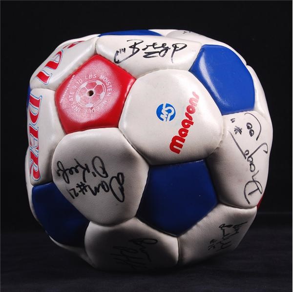 Raiders red, white and blue soccer ball signed by at least 14 members of the team in black sharpie. Signatures grade EX-MT.