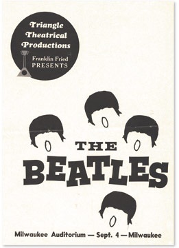 The 8 page program features a Ludwig drums advertisement picturing Ringo behind his trademark kit and congratulating the Beatles on their successful tour. Only Chicago, Forest Hills, and NYC's Paramount Theatre had customized programs prepared for the Summer 1964 tour. A generic picture program was sold in all cities. Has been quarter-folded. 6 1/4" x 9 1/4".