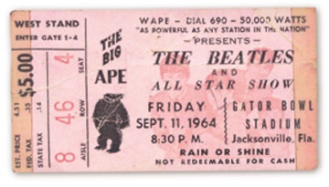 The Beatles and "The Big Ape" mascot of WAPE radio are pictured on this stub. While 32,000 tickets were sold, more than 9,000 couldn't make it to the gator Bowl due to Hurrican Dora's damage. Tape along both ends from being put into a scrapbook.