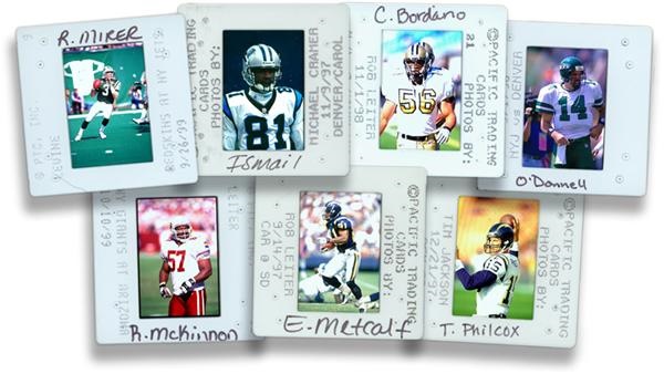Notes: Huge collection of 35mm slides from the files of the Pacific Card Company. All are color and date from 1997-1999 (a few later). Teams include Falcons, Cardinals, Browns, Panthers, Chargers, Ravens, Titans, Bengals, Saints, Buccaneers and Jets. The collection is relatively light on major stars given the team selection, but for image and team photo collectors the stars are common as the camera is always pointed at them, it is images of the regular players that present a challenge. The player pictured is identified on the slide mount.