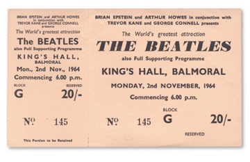 A supposed day off evolved into a flight to Ireland to appear in Befast at King's Hall for two performances. The unused oversized ticket proclaims the group as "The World's Greatest Attraction". Near mint! 6 1/4" x 3 3/4".