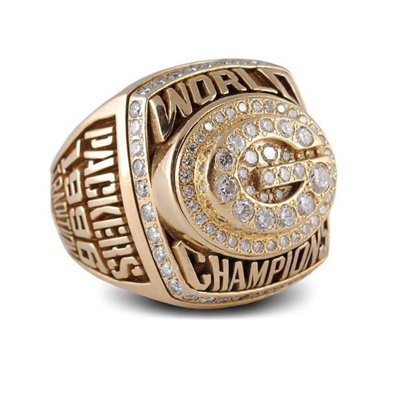 Notes: 10K gold Ring awarded to Bob Kuberski for his performance with the 1996 Superbowl Champion Green Bay Packers. “World Champions” in raised letters is on top of the bezel surrounded by over 90 diamonds of various sizes. The left side of the ring reads “Packers 1996 Tradition” while the right side has an image of a Packers helmet along with the words “Kuberski 16-3 94,” stamped inside the shank with several symbols. Size 11.