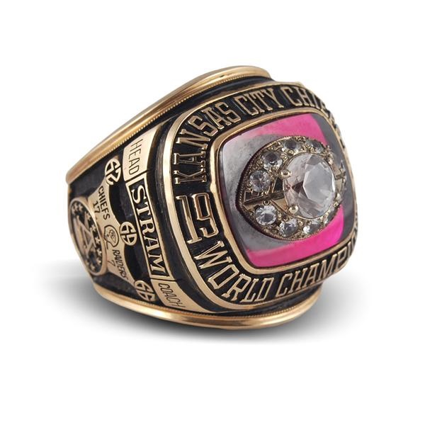Notes: Beautiful ring is nearly identical to those that the players received.  This vintage sample is stamped “Jostens 10K” inside the band.  Size 10.5. Red stone on top has faux diamonds set in a football shaped pattern.  Coach “Stram” is on one shank while “Chiefs 23-7 Vikings” is on the other.