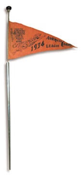 Exceptional piece is a serious walking stick in steel, topped with a wood knob and overall 36" in length. When the knob is pulled, out unfurls a pennant that is silk and 23" long. The pennant in orange and black, depicting a leaping tiger "1934 American League Champs" and names of the starters: Greenberg, White, Cochrane, Gehringer, Owen, Rogell, Goslin, Fox and Rowe. Overall EX.