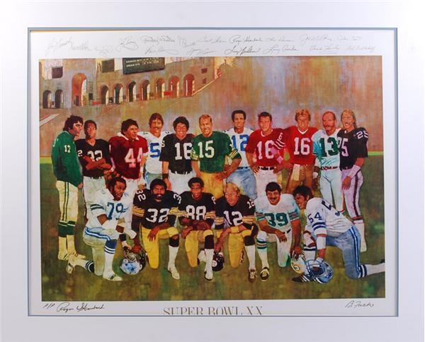 Notes: Printer’s proof by Bernie Fuchs is signed by 18 players including Joe Namath, Marcus Allen, John Riggins, Randy White, Jim Plunkett, Lynn Swan, Bart Starr, Roger Staubach, Len Dawson, Larry Csonka, Joe Montana, Fred Biletnikoff and more. Marked “PP” for printer’s proof and signed again by Staubach in the lower left corner. Matted and ready to be framed.