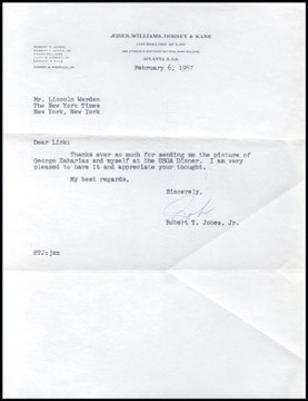 Wouldn't it be great to collect the autographs of all the Golden Age greats? Here's the golf representative, thanking a representative of the New York Times for sending him a photo of him with Babe's husband George Zaharias at the USGA Dinner. Typed on Jones' law office stationery. Closing signature, "Bob," is NRMT. Page is EX-MT.