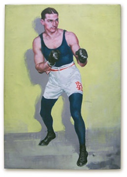 Dazzling oil on canvas of the greatest Jewish boxer of all. Very dramatic and "antique" look with yellow background and grey shadowing.