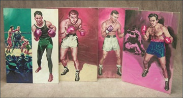 Impressive group of oils on board of great old fighters. Includes such eminent pugs as Marcel Cerdan (impressive image with shadowy side ring scene of this tragic husband of Edith Piaf), Johnny Dundee (the colors in the ring action are spectacular, one of the best ones here), Ingemar Johansson (simple ring shot is gorgeous), Gene Fullmer (powerfully dramatic look and feel). A wonderful group of equally wonderful quality.