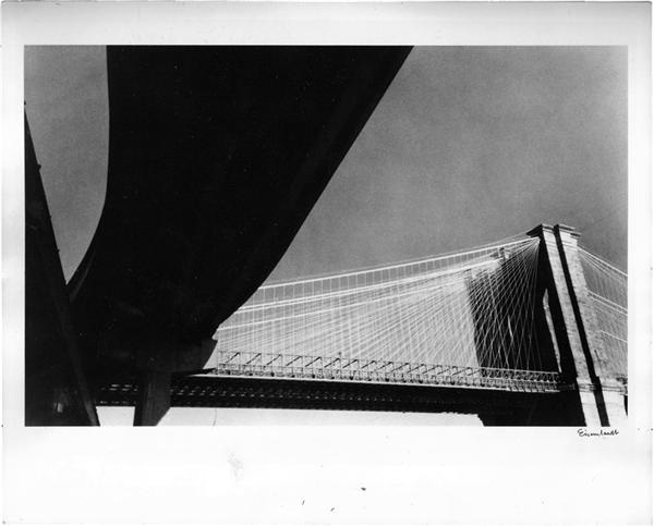 Image of the Brooklyn Bridge taken by the noted photographer Alfred Eisenstaedt. The offered print was issued by Time-Life and is stamped on the back “Life Picture Service Room” and “Property of Time Inc Reproduction Forbidden Without Express Consent.” Handwritten is the name of the photographer along with “Time Inc. From: Alfred Eisenstaedt’s Brooklyn Bridge / A Life Portfolio....Photographed for its 100th Anniversary.” Printed in the 1980s.