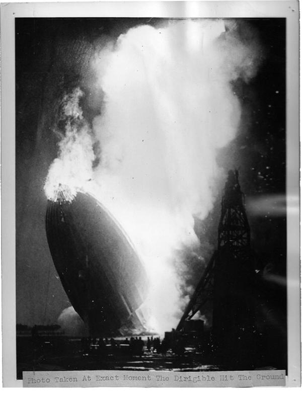 Unforgettable image of the Hindenburg as it crashes to the ground in flames. Dated 4/7/37. 6.5x8.5’’, EX-MT.