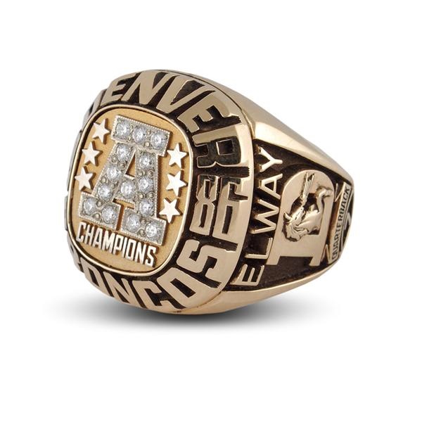 Notes: 10K gold sample ring has the words “Denver Broncos” and “1986” surrounding thirteen real diamonds. “ELWAY” on one shank over the Broncos logo and the word “Quarterback.” Stamped inside “LGB 10K.” Condition: NRMT condition.