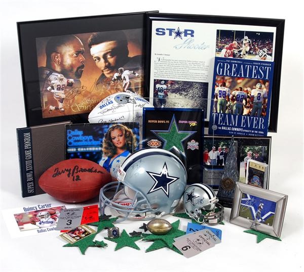 Notes: This vast accumulation comes directly from the personal collection of Ron St. Angelo, Pulitzer Prize winning photographer for the Dallas Cowboys. This huge horde includes (A) Immense lot of personal letters from Tex Schramm, Tom Landry, Troy Aikman, Jerry Jones, Roger Staubach, Jimmy Johnson and Barry Switzer (C) Cowboys Helmet signed and numbered by Emmitt Smith, (D) Autographed football: Aikman, Smith, White, Renfro, Staubach, Dorsett, Lilly and Sanders. (E) Mini Dallas Cowboys helmet signed by Daryl Johnston, (F) Greatest Team Ever signed by Michael Irvin, (G) Emmitt Smith signed hardcover SB XXVIII program and print. I) 1989 signed Troy Aikman lithograph, (J) signed Bill Parcells (K) numerous game credentials from the regular season, playoff games and the Super Bowl. (L) Three Troy Aikman & Emmitt Smith signed Super Bowl lithos and Emmitt Smith signed litho, (M) NFL football signed by Terry Bradshaw, (N) rookie signing print autographed by Aikman, Jimmy Johnson and Jerry Jones, (O) 12 Super Bowl XXX lithos, one signed by Aikman and all signed by the artist and photographer. There is much, much more to this collection!