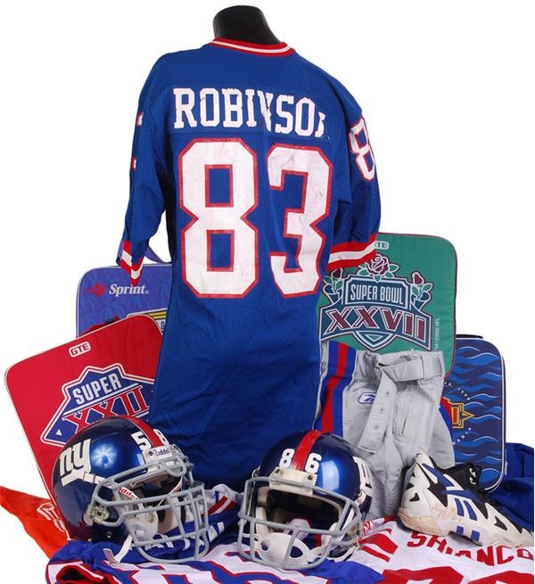 Notes: Assortment of Super Bowl seat cushions from Super Bowl XXII, XXVI, XXVII, XXXII, XXXIII, and XXXIV, as well as a Super Bowl XXV orange vest, all in EX shape. Game worn jerseys and pants include (A) #81 Lewis, white jersey with 95 tag on the right front tail, (B) size 34 pants with the number 74 written inside the waistband and an apex logo embroidered on the front, (C) #97 white jersey, (D) #82 Shancoe jersey with 05-42 tagging inside the collar and NFL and WTM/NY/PRT tagging on the front left chest and NFL and Reebok tagging, 2lb and 42 on the left front tail, (E) #85 Patten blue jersey with 99-42 tagging in the neckline, a MeiGray group 1999 set 1 tag on the left front tail and a NY 75 year Anniversary patch on the left shoulder size 42 with NY Giants and Cosby tagging on the left front tail, (F) #83 Robinson blue jersey, (G) a pair of gray size 34 pants with NFL tagging on the front, an 03 tag inside the waistband and the #88 handwritten in the waist band and finally (H) a pair of size 11 1/2 Reebok sneakers with the #27 written on the back of each shoe.. Also included in this lot are Jim Tunney’s game worn NFL referee shirt (LOA), and a mid-1970’s game worn rain poncho which also has an (LOA) from the team’s equipment manager. There is a size 48 side line jacket with a Thorp sporting Goods tag and the initials H.E. handwritten inside, a size large #37 sideline cape and finally (2) Riddell helmets, one numbered 58 with c-8899 written inside and # 86.