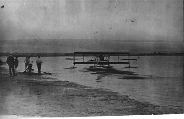 “First photograph” of the first successful flight of the hydroplane by this legendary aviation pioneer. Original paper caption on verso. 5x8.5”, EX-MT.
